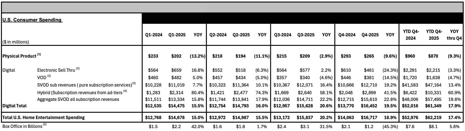 - "Samlet amerikansk forbrug på tværs af digitale og fysiske hjemmeunderholdningsformater i 2025 udgjorde 62,2 milliarder dollar, en stigning på 17,4% fra de næsten 53 milliarder dollar, som forbrugerne brugte i 2024, drevet af fortsat stærk fremgang inden for abonnementbaseret streaming med hjælp fra digitale transaktioner tidligt på året," skriver brancheforeningen DEG.