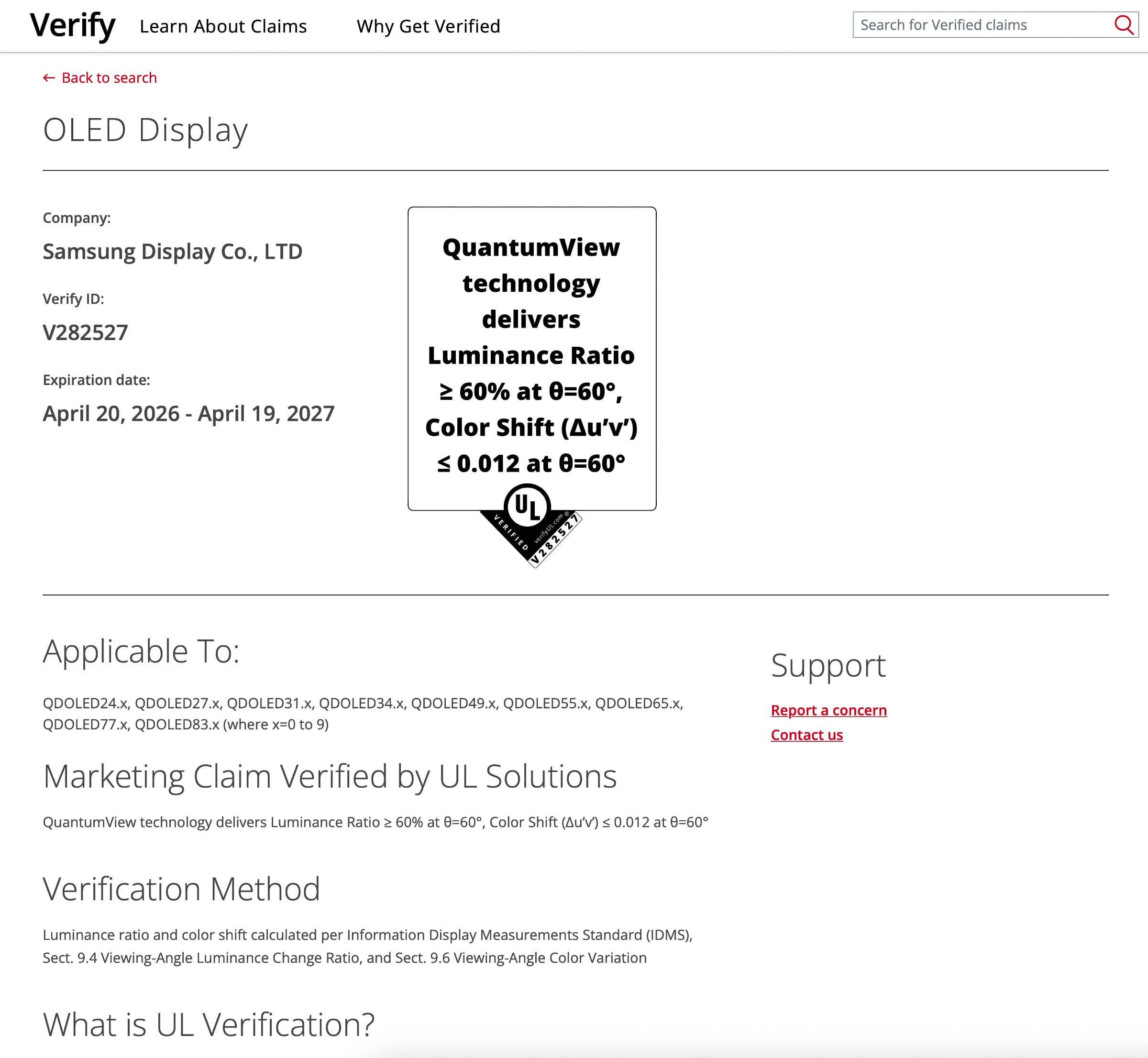 - "Hele QD-OLED-udvalget blev evalueret med succes, med over 60% lysstyrke selv ved en 60-graders betragtningsvinkel, samt en minimal farveafvigelse på under 0,012 Δu'v' (Delta u'v'). Det sikrer ensartet billedkvalitet på tværs af en bred vifte af anvendelser – fra TV til dual monitors og professionelle reference-skærme," skrev Samsung Display i en pressemeddelelse tidligere på ugen i forbindelse med UL Solutions certificering.