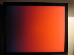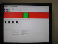 Så kontrasten blev hurtigt indstillet til et mindre konsekvent niveau og så tog jeg indstillingen af skærmen herfra.Efter en del tid med indstilling at lys og farver opnåede jeg faktisk et nogenlunde resultat på skrivebordet. Farverne var forholdsvis klare og fyldige. For ikke at tage glæderne på forskud begyndte jeg at kigge lidt på tests i monitorTest. Bl.a. gradienter og skærmens egenskaber til at skelne de forskellige farver fra hinanden.