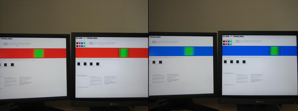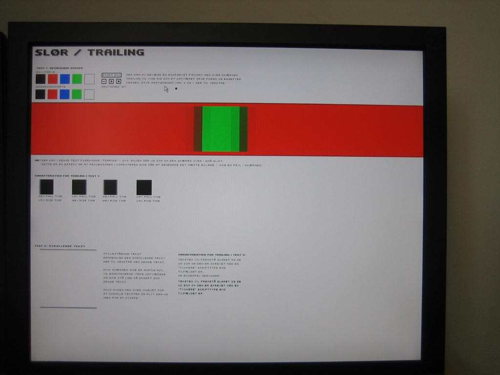 Faktisk er det så lavt er det har en ret markant påvirkning af responstiden. Det medførte sort slør i farveovergange. Se hvad jeg mener nedenfor, hvor jeg har prøvet at fange momentet med et kamera i monitorTest:At sløret er ret markant og"firkantet" bør du ikke lægge så meget i - jo skærmen trækker utrolig meget slør, men det vender vi tilbage til. At sløret ser ret mærkeligt ud skyldes mit kameraets lukketid, som desværre ikke er mulig at indstille.