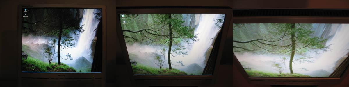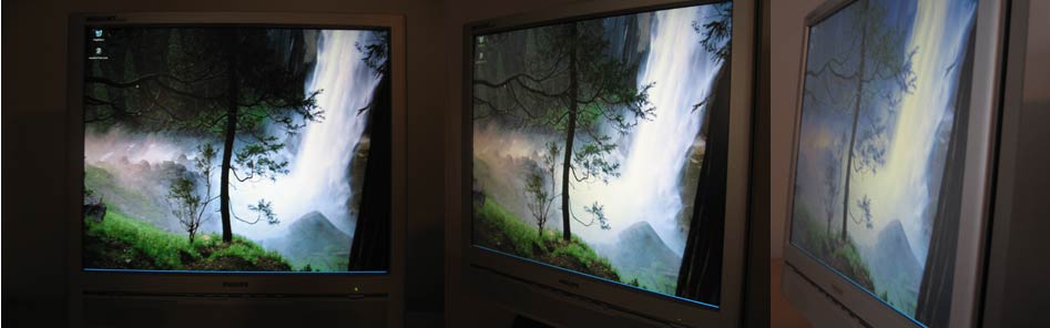 Det er primært de vertikale vinkler jeg vil sætte fingeren på. Billedets farve og kontrast bliver ikke komplementært nedefra, som det ses på nogle TN paneler, men der er forskel på hvordan billedet ses, hvis man sidder op i stolen eller hvis man lægger lidt ned i stolen. Det kan f.eks. ses i nogle af de gradienter jeg har taget billeder af herunder, men ellers er det vist herunder for de vertikale og horisontale: