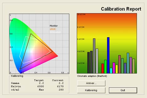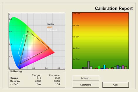 Et fint resultat for en gamerskærm og det er på højde med det jeg så på VX922 for kort tid siden når man snakker farvepræcision. Sort er blevet en del dybere i forhold til starten, men stadig ikke lige så dyb som på VX922. Jeg har målt den til 0,6 cd/m2 efter kalibrering. Reelt set giver det et kontrastforhold på 185/0,6 = 308:1 (+/- 30).