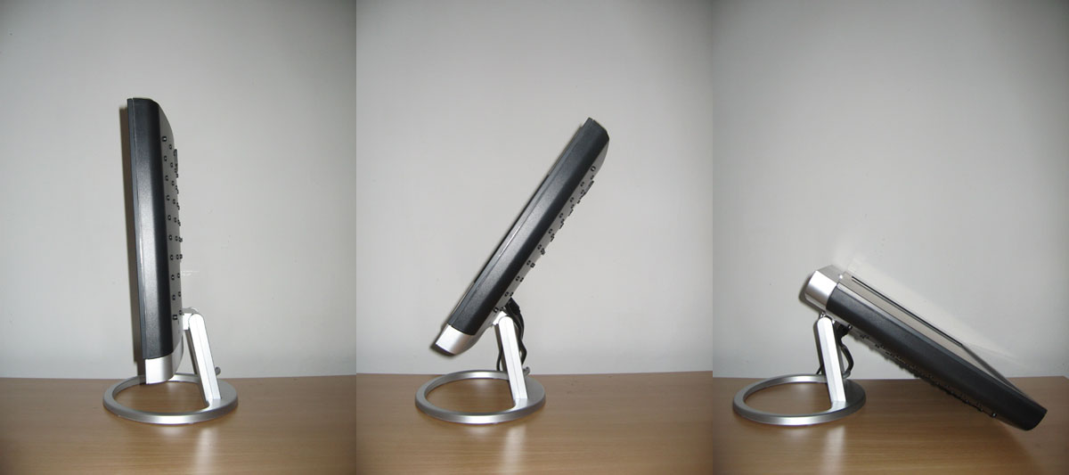 Foden er ikke helt lige så kraftig, som skærmens ramme, men virker alligevel passende i den samlede konstruktion. Jeg savner dog nogle ergonomiske muligheder. Det er kun muligt at tilte skærmen frem og tilbage og højdejustering ville være kærkomment. Du ser herunder tre billeder. Det første er skærmen i den størst mulige fremadrettede tilposition. Det andet billede er den størst mullige bagudrettede tiltjustering før skærmen vælter eller ikke står stabilt længere.