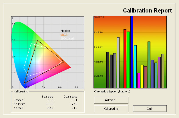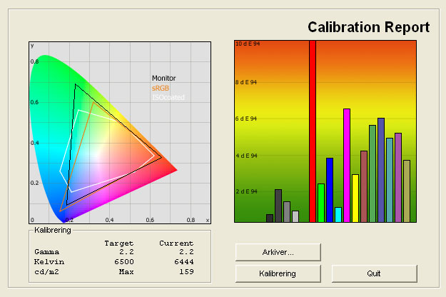 Farverne på skærmen fra standard af, er dog ikke helt præcise, og de lyse farver er der lidt for store variationer i. Jeg har prøvet at måle skærmens farvegengivelse med det samme: