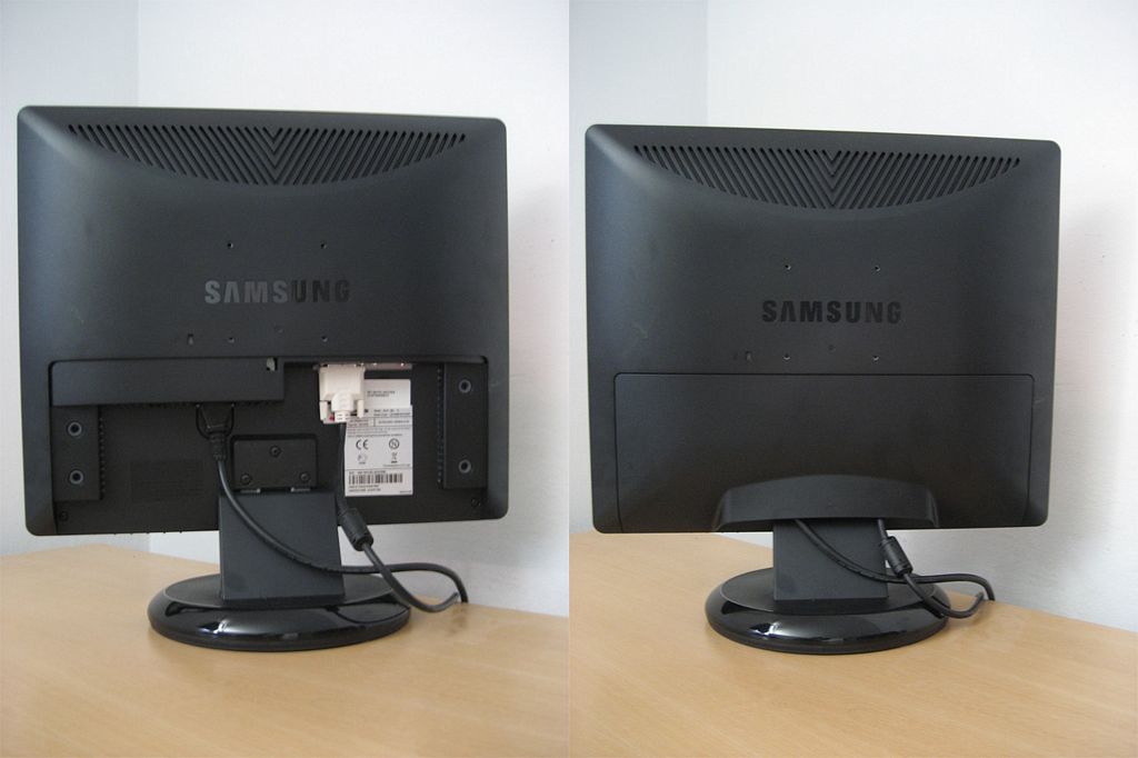 På bagsiden af skærmen skal man afmontere noget af skærmens ryg for at sætte kabler i. Det fungerer godt som en kabelskjuler, specielt fordi kablerne så føres ned bag skærmens fod og derved ikke er synlige, når man sidder foran skærmen.
