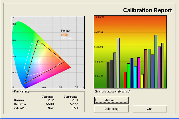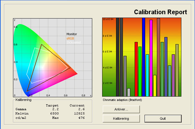 Gamma’en, altså forløbet af lys fra sort til hvid, kunne ikke gøres perfekt, og ved at ændre på brightness, rykkede jeg gammakurven en smule. Skærmen har generelt lidt for lyse hvide nuancer og lidt for mørke sorte nuancer. Det kompromis jeg fandt frem til, var dog ganske fornuftigt set i lyset af, at man ikke kan udbedre fejlen pga. manglende indstillingsmuligheder.