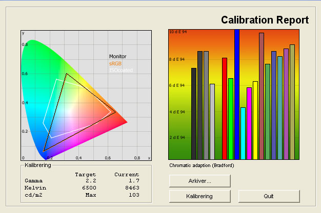 Jeg vil dog anbefale brugeren at vælge farvetemperaturen, som hedder varm. Den giver et væsentligt bedre billede end normal, og så kan man eventuelt tage udgangspunkt i varm-profilen før en eventuel kalibrering. Ved Varm profilen er rød, grøn og blå en smule for høje, men ligger på nogenlunde samme niveau. Ved normal-profilen var afvigelsen større, både den overordnede, men også de tre farver imellem.