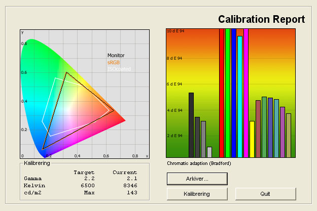Målingen for Karvias Tv viser flere ting. Generelt er afvigelserne lidt for høje og det kan også godt fornemmes i billedet. Omvendt er lysstyrken og gamma dog ganske fornuftige, hvorfor billedet heller ikke synes ude af balance.