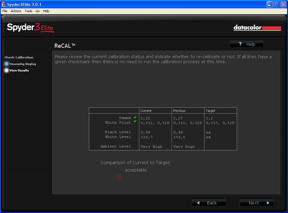 Her kan det blandt andet tjekkes, om ens nuværende kalibrering er tæt på målet, ligesom der vises før og efter grafer. Ydermere kan belysningen i rummet måles og der kan tages hensyn til denne under kalibreringen.
