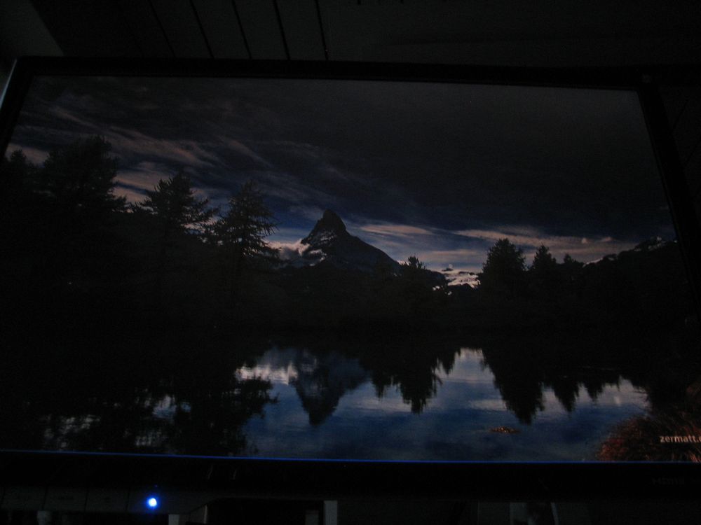 Sortgengivelsen er imidlertid også afhængig af om skærmen lader lys slippe igennem – f.eks. i hjørnerne. Det har traditionelt været et problem med LCD teknologien og problemet løses stadig ikke fuldstændig før man introducerer LEDs i stedet for de fluorescerende lamper som baggrundsbelysning, men indenfor det seneste år har producenterne alligevel fået bedre styr på ujævn baggrundsbelysning. Jeg har herunder taget et billede af BenQ V2400W i et helt mørkt rum, for at undersøge hvordan skærmen klarer opgaven: