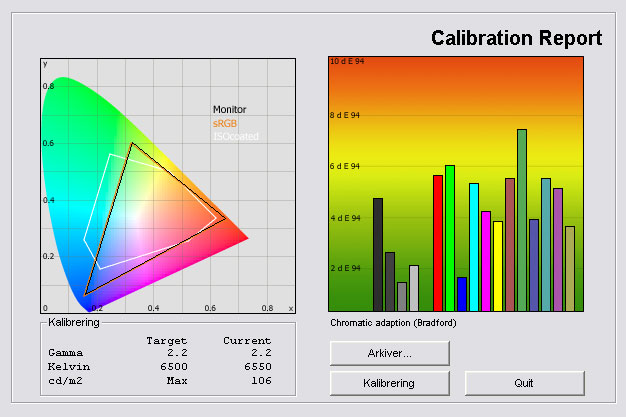 Bemærk, at skærmen benytter mindre strøm efter en kalibrering. Dette er et generelt træk for fladskærme, fordi der efter kalibrering typisk er skruet ned for wauw-effekten, blandt andet med en lavere lysstyrke som resultat.