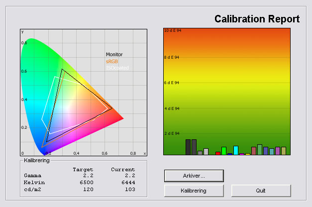 Desværre forskyder farvespektret sig en anelse efter kalibrering, som du kan se på billedet med målingerne oven for. Skærmen trækker en smule mod grøn, og er ikke helt i stand til at gengive komplet blå (Kig på den sorte trekant i diagrammets venstre side. Den ideelle er den orange).