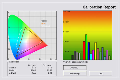 Farvetemperaturen er nu lidt for høj. Det giver et billede, der er en anelse for blåligt, uden det dog er kritisk. Lysstyrken er dog stadig ret høj med 252 cd/m2, så den vil vi gerne forsøge at forbedre efter kalibrering.
