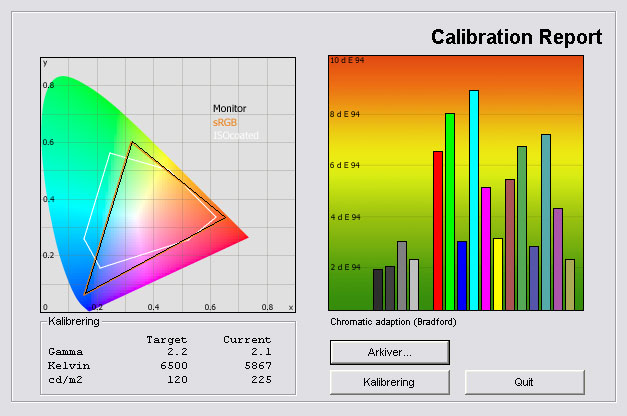 Jeg tog også en måling i skærmens AdobeRGB profil. Denne er særlig interessant fordi U2711 er i stand til at gengive et meget stort farvespekter, så U2711 også kan bruges til at grafiske arbejde i AdobeRGB miljøer.