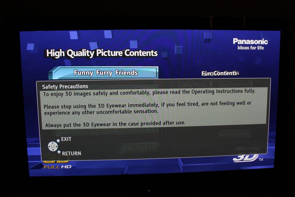 For at afspille 3D indhold, har du brug for en 3D Blu-ray-afspiller. I denne test anvendte vi Panasonic BDT-300. Herudover har du også brug for noget 3D-indhold og det er der ikke meget af lige i øjeblikket. Vi brugte en 3D demoskive med en række forskellige 3D demoer lige fra dokumentarfilm til film til spil (ikke spilbare). 3D diske afspilles i øvrigt som traditionelle 2D-diske på konventionelle 2D Blu-ray afspillere.Der medfølger to par 3D briller til VT20 (som standard, visse forhandlere sælger modellen uden 3D briller). Brillerne kommer med 2 forskellige næse-enheder som kan monteres efter behag. 3D brillerne på Panasonic VT20 er aktive, hvilket betyder, at de kommunikerer med Tv’et og har et aktivt til / fra system, der skiftevis lukker for hvert øje. Det betyder naturligvis også, at de kræver batterier. Disse indsættes i siden. Brillerne kan ikke oplades gennem f.eks. en computer, hvilket er lidt skørt.