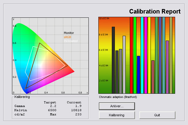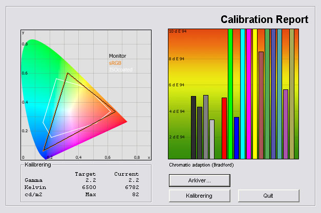Efter kalibrering endte jeg med gamma-kurve der gik fra 2,1 til 2,26, hvilket er pænt, men ikke perfekt. Vores mål er 2,2. Farvetemperaturen er meget tæt på de 6500 Kelvin, som vi sigter efter og lysstyrken blev målt til 94 cd/m2, hvilket er en fin værdi til mørke rum.