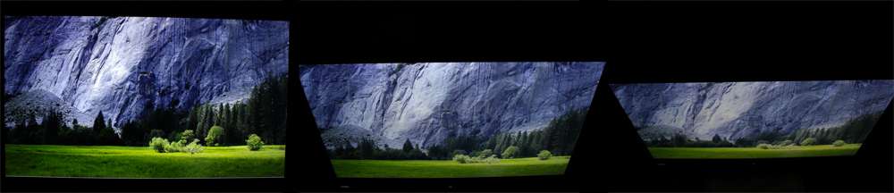 Betragtningsvinklerne er bedre end på tidligere Sharp LCD-TV og det er positivt – men dog på niveau med LE820 modellen. Farveintensitet reduceres dog stadig fra vinkler og nogle farver skifter nuance fra vinkler. Herunder kan du se et billede af betragtningsvinklerne.Den mest markante ændring, sker imidlertid i kontrasten, og fra vinkler bliver den sorte farve grålig. Se billedet nedenfor. På dette punkt er absolut plads til forbedring.