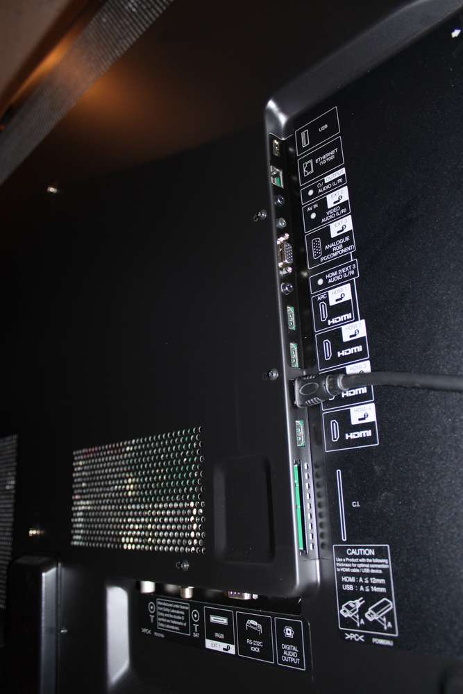 Indgangene er placeret på bagsiden af kabinettet og peger enten til siden eller nedad. Dette er praktisk, hvis du ønsker at vægmontering TV'et tæt på væggen, så det er meget positivt. Bemærk også den høje, aflande CI-port nederst. Denne anvende sitl at indsætte programkort fra f.eks. YouSee eller Canal Digital, idet LE925 har både DVB-C tuner til kabel-Tv og DVB-S tuner til parabol.