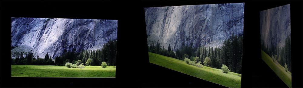 Kontrasten reduceres fra vinkler som nævnt i billedkvalitets-afsnittet. Det betyder, at den sorte farve fremstår mere grålig fra en vinkel og det derfor anbefales at sidde lige for skærmen når man ser f.eks. film.