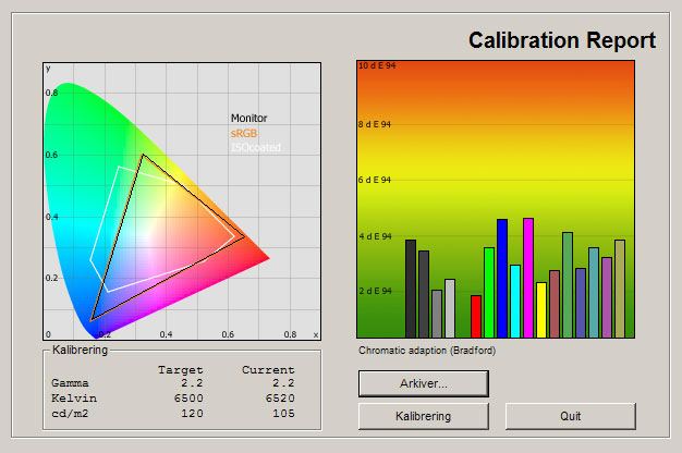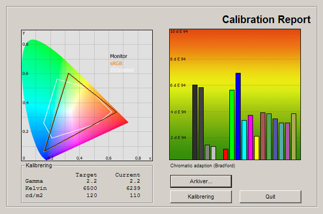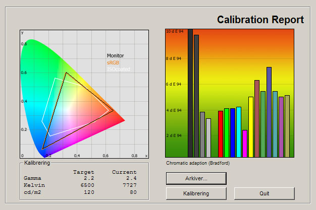 Efter kalibrering var jeg i stand til at forbedre gamma, men der er stadig lidt problemer i den mørke ende af gråtoneskalaen, så ikke alle mørke farvenuancer skelnes korrekt. Det lykkedes dog at forbedre farvenøjagtigheden og få farvetemperaturen nøjagtigt, så billedet hverken fremstår for blåligt eller rødligt. Alt i alt et fint resultat.