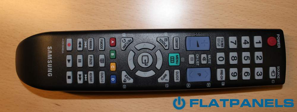 I boksen fandt vi dette rumskib af en fjernbetjening. Det er efterhånden hvad vi forventer fra et prisbilligt Tv, men vi har stadig et brændende ønske om, at producenterne ville begynde at lægge lidt mere sjæl i udformningen og designet af fjernbetjeninger. De skal trods alt ligge på stuebordet hver eneste dag.Samsung D555 har fået frarøvet Samsungs Smart TV-funktionalitet for at spare på omkostningerne. De eneste mediefunktioner som findes, er USB-afspilning og DLNA. Samsung understøtter en række video- og lyd-formater til afspilning via DLNA (Allshare), men hvis du søger en komplet DLNA streaming-løsning vil vi råde dig til at kigge på eksterne bokse, som klarer opgaven bedre. D555 har en indbygget Ethernet-port til netværkskabler; hvis du vil have trådløst netværk kan du tilkøbe en WiFI USB-dongle fra Samsung.