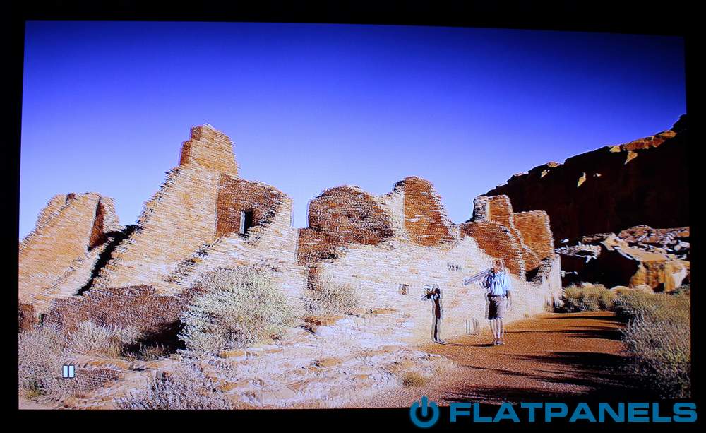 Skal vi dykke lidt længere ned i gengivelsen af bevægelse og responstid, så må vi sige, at selvom en smule sløring kan registreres i vores stresstest, så er E8005 en virkelig hurtig skærm og har også visse fordele i forhold til Panasonics plasma-TV, herunder VT50. Fosfor-slør er ikke lige synligt på Samsungs tv, hvilket i øvrigt også har været tilfældet på sidste års modeller. Vi kan stadig registrere fosfor-slør (rødt/blåt/grønt slør) i vores krævende tests, men det blev aldrig noteret i blandt tv-brug. Det betyder også, at særligt sort/hvid-film eller scener med høj kontrast gengives en smule bedre på E8005 end VT50. Vi bemærkede dog samme ”pixelstøj” omkring objekter i hurtige bevægelser på E8005; et problem som vi også klagede også bemærkede på sidste års Panasonic-modeller. Det er ikke kritisk, men det fjerner fine detaljer omkring objekter der bevæger sig hurtigt henover skærmen, hvilket er en skam.