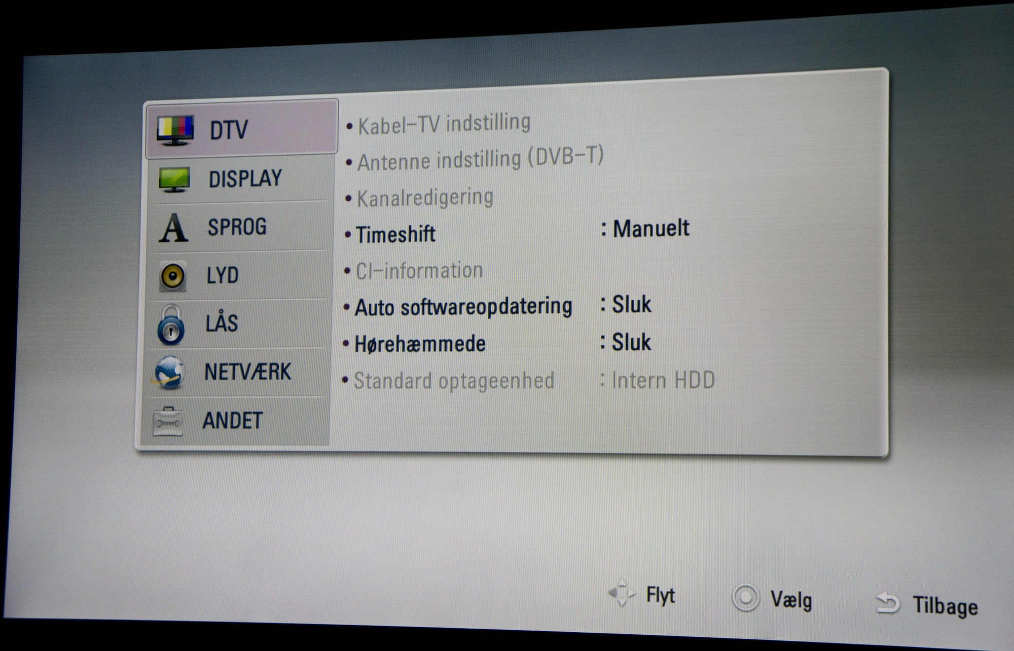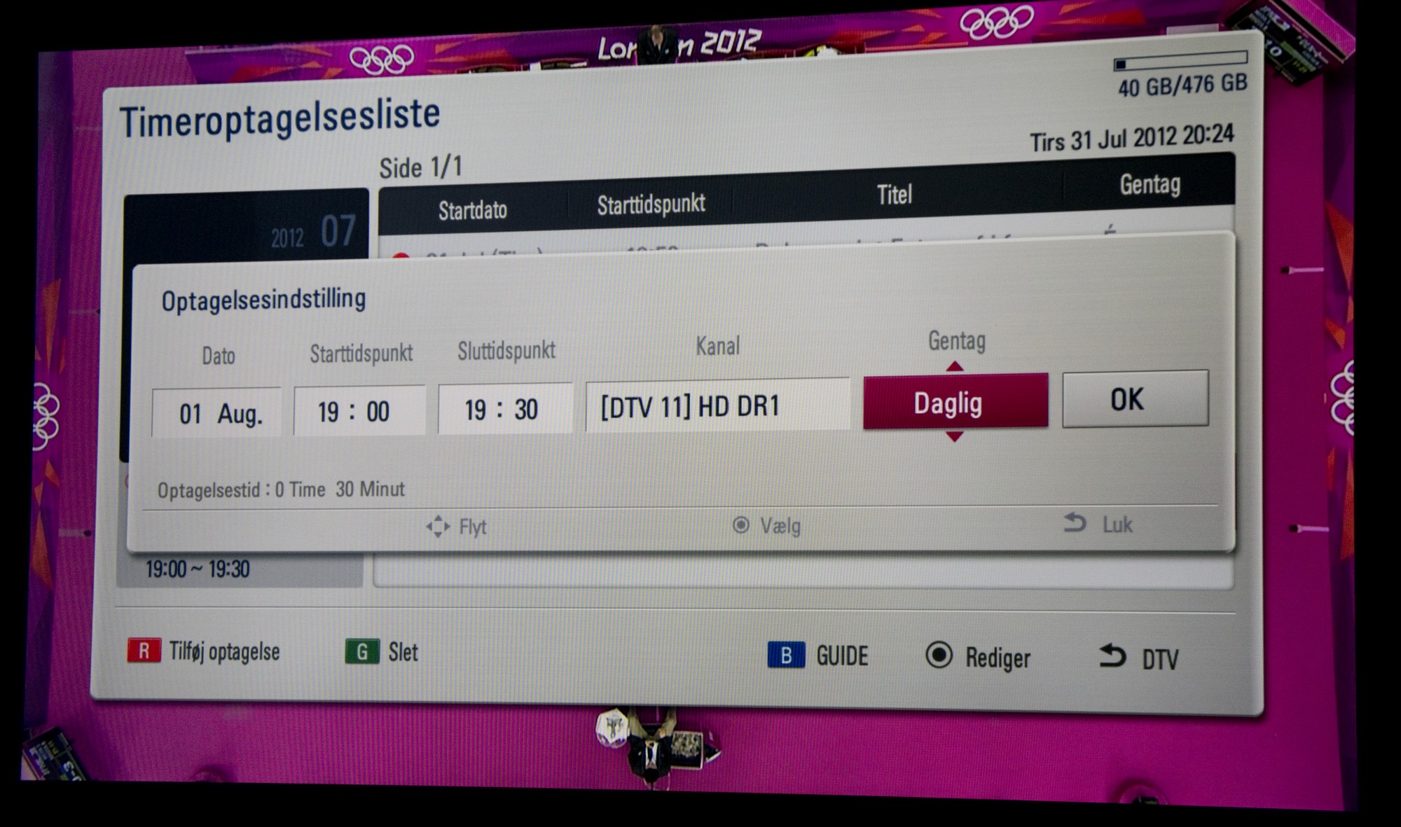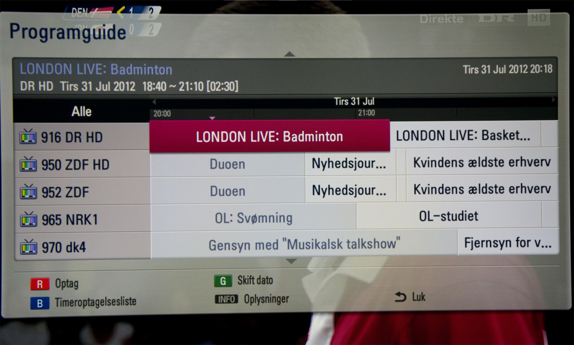 Den indledende opsætning var enkel og autosøgningen på kabel-tuneren fandt samtlige kanaler uden problemer (på trods af det uskærmede stik på vores antennekabel). Selve søgningen var dog godt 15 minutter om at færdiggøres. Efter kanalsøgningen er der mulighed for at redigere i kanaloversigten, men desværre så er de eneste muligheder man her har adgang til at fjerne en kanal fra oversigten eller at indstille den til at overspringes hvis man zapper igennem kanalerne. Der er ingen mulighed for at sortere kanalerne eller oprette favoritlister, hvilket betyder at man er tvunget til at se kanalerne i programoversigten i den rækkefølge de optræder hos udbyderen. De fleste har nok en foretrukken rækkefølge deres kanaler skal vises i, hvilket kan være lidt af en showstopper når formålet med HR925 netop er at navigere og optage via programoversigten. LG oplyser, at man er bekendt med problemet og at man agter at udgive en opdatering senere på året, som muliggør sortering af kanalerne.Ud over manglen på kanalsortering, så er programguiden dog overskuelig og fin i brug. I modsætning til mange almindelige TV, så kører kanalen også videre i baggrunden når guiden åbnes, hvilket gør det muligt at følge en smule med imens man kigger på oversigten. Da guiden dækker det meste af billedet er det dog primært lyden man har gavn af. Ift. Yousees programguide, så er der kun plads til 5 kanaler i listen, så der skal nogle flere tastetryk til for at se de øvrige kanaler. Jeg kunne godt have brugt lidt flere kanaler på hver side, men det er ikke et kæmpe problem. Der kan dog scrolles i hele sider af gangen ved at bruge kanal+/- knapperne i programguiden.