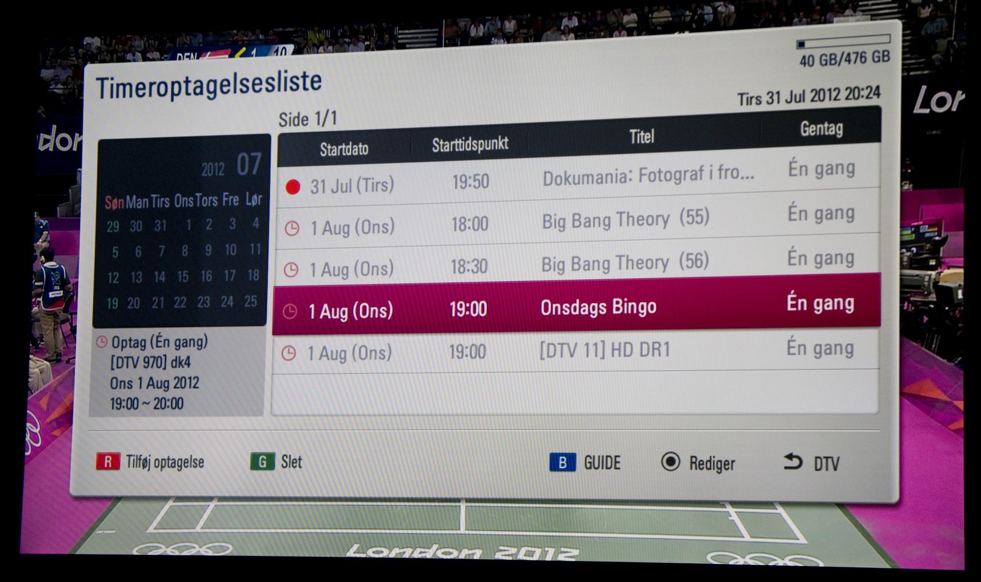 For at optage et program via programguiden benyttes den røde ”R”-tast der frembringer optagemenuen, der tydeligvis var tiltænkt at have lidt flere funktioner end de der rent faktisk er tilgængelige. Menuen burde give adgang til at oprette eks. serieoptagelser eller andre skemalagte optagelser ved at vælge fra en 4-punkts menu, men pt. er det kun ”optag”-funktionen som virker, hvilket gør menuen en smule redundant. Har kunne man godt have kigget Samsung lidt over skulderen og ladet den røde ”R”-tast fungere som direkte valg af at skemalægge en optagelse af det markerede program, så man slap for det ekstra tryk for at vælge ”optag”. LG er gjort opmærksom på den manglende funktionalitet af denne menu og forhåbentlig kan vi se en udvidelse af funktionaliteten i en fremtidig opdatering.
