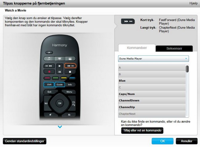 Hvis du har behov for se det fulde overblik, så kan det anbefales at besøge myharmony.com fra en computer (ikke fra en tablet, da der kræves Microsoft Silverlight plugin) for at tweake lidt på knapperne. Her kan du også styre den dobbeltfunktion alle taster har fået, idet Smart Control tillader lange og korte tryk at have forskellig funktion. Det gør det en del nemmere, at få klemt alle de funktioner man har brug for ind på knap-layoutet på den medfølgende fysiske fjernbetjening.