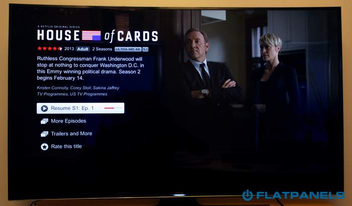 Som du sikkert har hørt, så har Netflix introduceret 4K-streaming for få uger siden. 2014 Smart TV er de første enheder som understøtter Netflix i 4K, og Samsungs TV kan streame 4K fra Netflix nu. Det fremfår f.eks. fra Netflix app’en, hvor der fremgår et "Ultra HD 4K"-logoet i øverste venstre hjørne af House of Cards sæson 2 (sæson 1 er ikke tilgængelig i 4K). Dette er nok den vigtigste nyskabelse i Samsungs tv. Og vi kan ærligt sige, at det ser fantastisk ud.