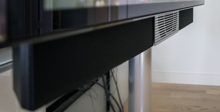 Materialerne på forsiden er dermed i vanlig B&O kvalitet - glas og metal, samlet med sans for detaljen. Bevæger vi os om på bagsiden, så er samme æstetiske udtryk dog ikke helt så clean. Bagsiden består af tre "lag". Øverst er selve skærmpanelet dækket af en sort metalplade, og længere nede kommer første udposning i form af en plasticbeklædning hvor elektronikken er gemt bag. For at få adgang til tilslutningerne til skærmen har man dernæst dækket en del af denne plastic-bagside med to metalplader, som skydes ind fra siden når alle forbindelser er sat i (dvs. ingen skruehuller er synlige). Bag den venstre plade gemmer sig alle forbindelserne og her finder du også plads til at gemme en USB-harddisk til brug ved optagelse, samt eks. en medieboks i Apple-TV-størrelse. Bag den højre gemmer subwooferen sig.