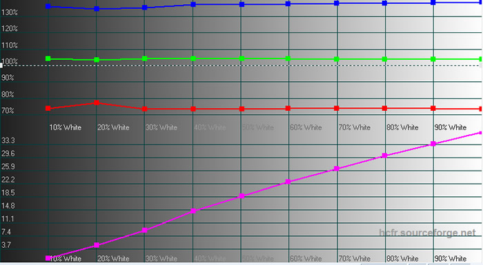 Dette bekræftes ved at kaste et blik på temperaturkurven, hvor vi måler tæt på 10000K farvetemperatur. Dette er som nævnt ikke usædvanligt for B&O, men det er ret langt fra det D65 hvidpunkt man normalt sigter efter, som har en temperatur på 6500K.