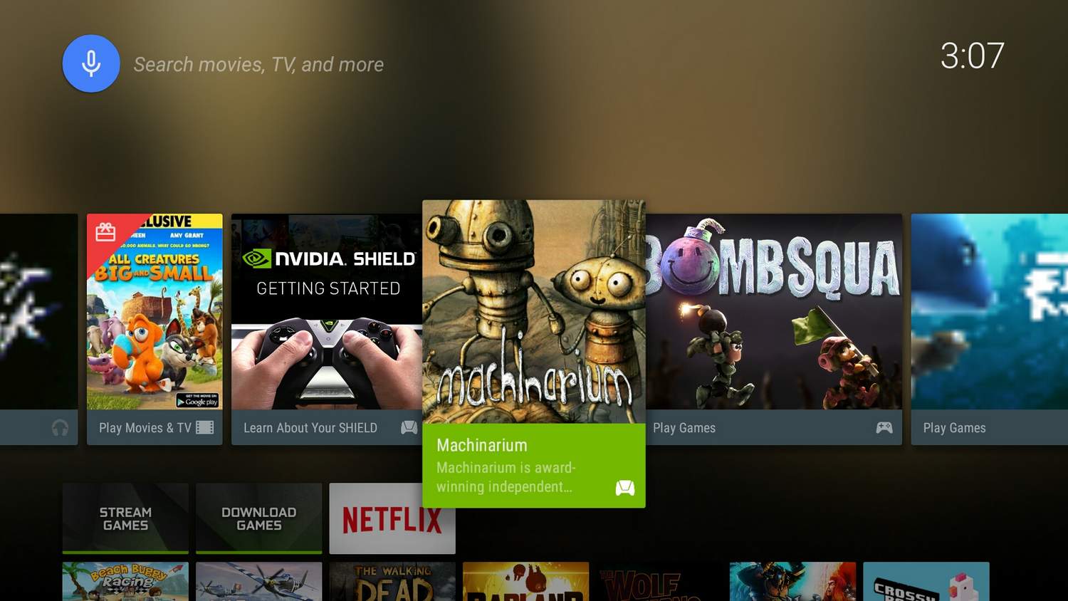 I forhold til Nexus Player, der var første boks baseret på Android TV, har Nvidia fået deres egen dedikerede række af tjenester. Den bruger de til at fremhæve deres spiltjenester, hvilket naturligvis giver mening i og med, at Shield først og fremmest er en spilkonsol. Hvad der derimod ikke giver mening er hvorfor Netflix er placeret heroppe i stedet for nede ved de andre apps. Når det er sagt, ligner tingene dog i store træk sig selv. Det er i øvrigt præcis samme brugerflade som på tv-skærme med Android TV indbygget. Producenterne har ikke lov til at ændre på brugerfladen, ligesom producenter af Android-telefoner har det.