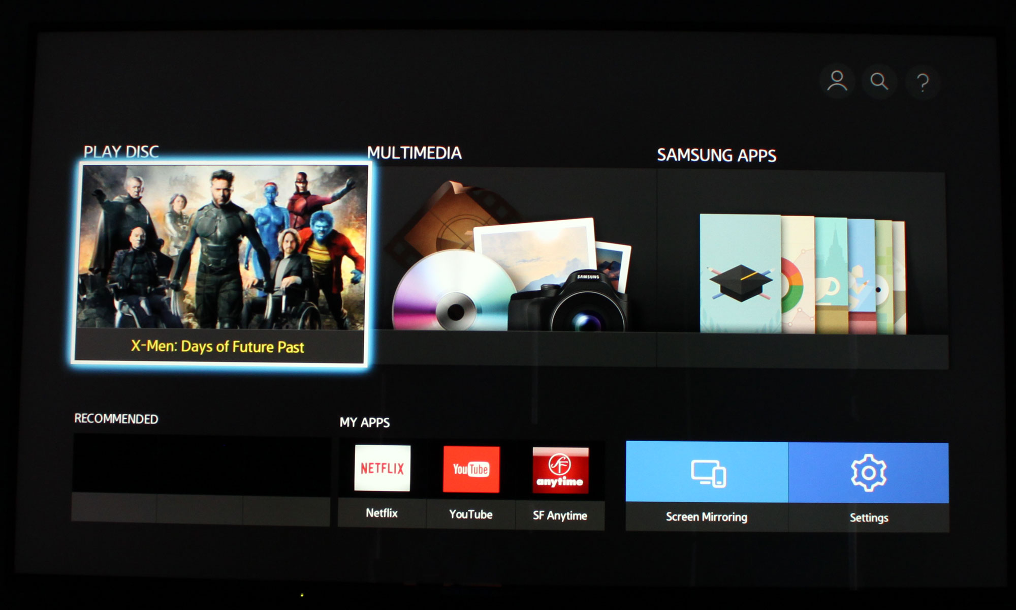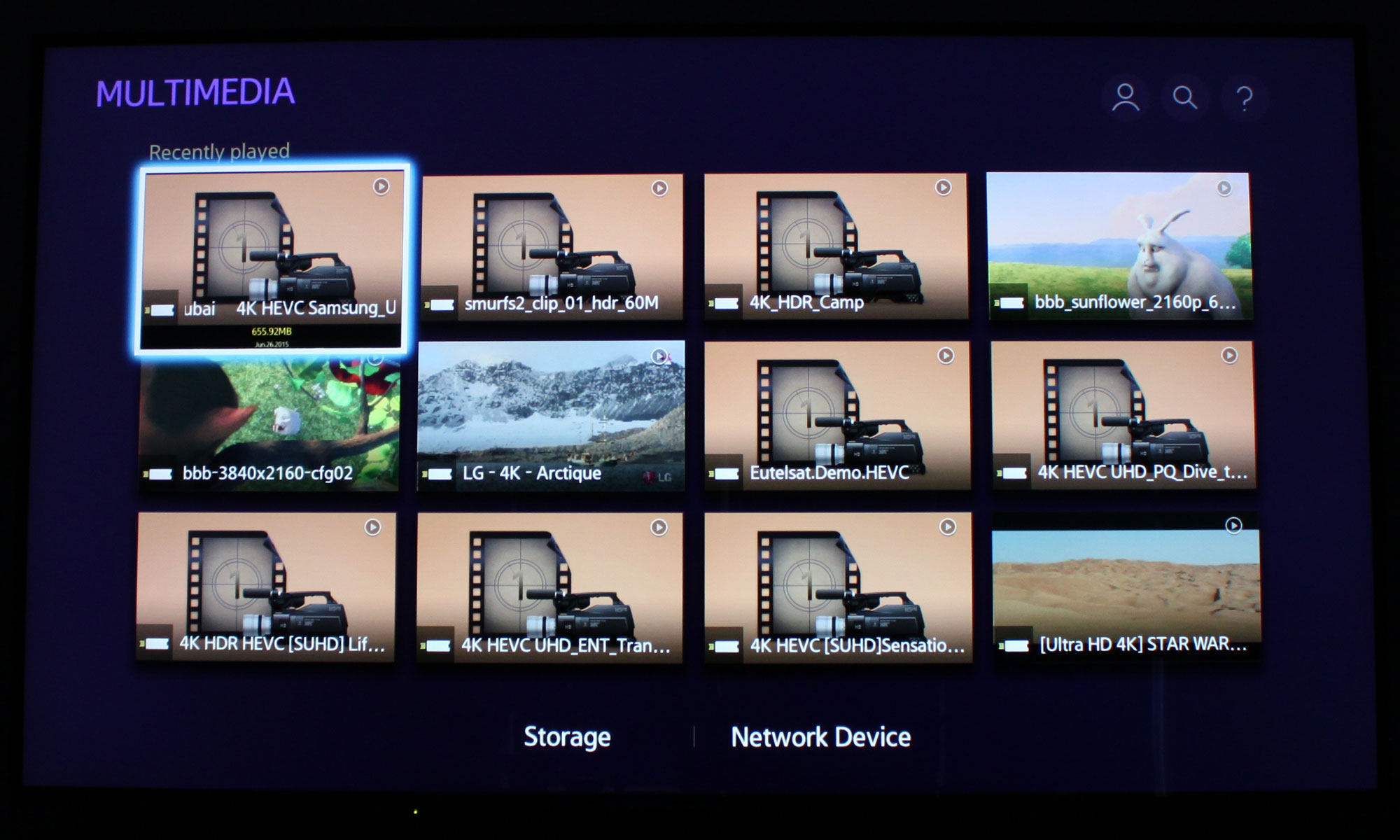 Brugerfladen er opbygget om tre firkantede kasser: Blu-ray, Multimedia og Samsung apps samt tre mindre kasser nedenunder. Under Multimedia har du adgang til videofiler og fotos fra en USB-nøgle eller harddisk. Vi kørte vores forskellige 4K og HDR demoklip igennem og afspilleren accepterer langt størstedelen. Det er således muligt at tilslutte en USB-harddisk med f.eks. film. Du kan se hvad vi fik igennem nåleøjet i afsnittet "Målinger".