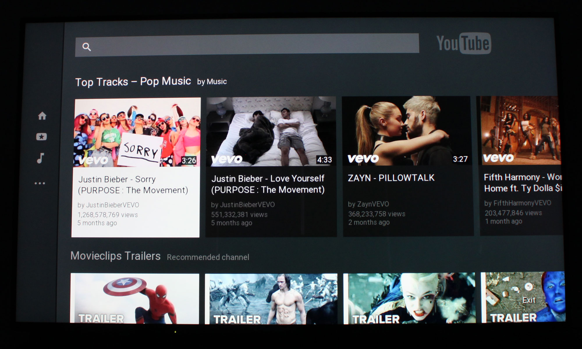 YouTube-app’en er også den klassiske tv-brugerflade. Hvis du er logget ind har du adgang til de kanaler, som du abonnerer på. Der er endda en 4K-kategori i app’en. YouTube app’en understøtter 4K, men der er ikke udsigt til at den vil understøtte HDR, når YouTube lancerer det lidt senere i 2016.