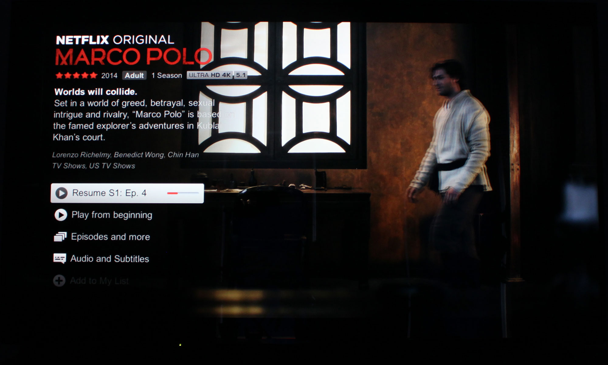Skridtet ned til mellemklasse-tv såsom Panasonic DX750, Sony XD85 og Philips 7101 betyder, at man må nøjes. Forskellen er markant. Desværre har disse skærme ikke hardwaren til at gengive HDR, og det viser sig tydeligt. På disse mellemklasse-tv er den mest markante forskel ift. normale Blu-ray-skiver i HD-opløsning faktisk ikke skridtet til 4K-opløsning, men det større farverum - i hvert fald i de film vi har set indtil videre. Du vil igen bemærke hvordan særligt nuancer af rød og grøn kan være mere mættede. Desværre opleves billedet ikke med samme dynamik som på særligt DX900, og det betyder mere for billedoplevelsen end man umiddelbart skulle tro.