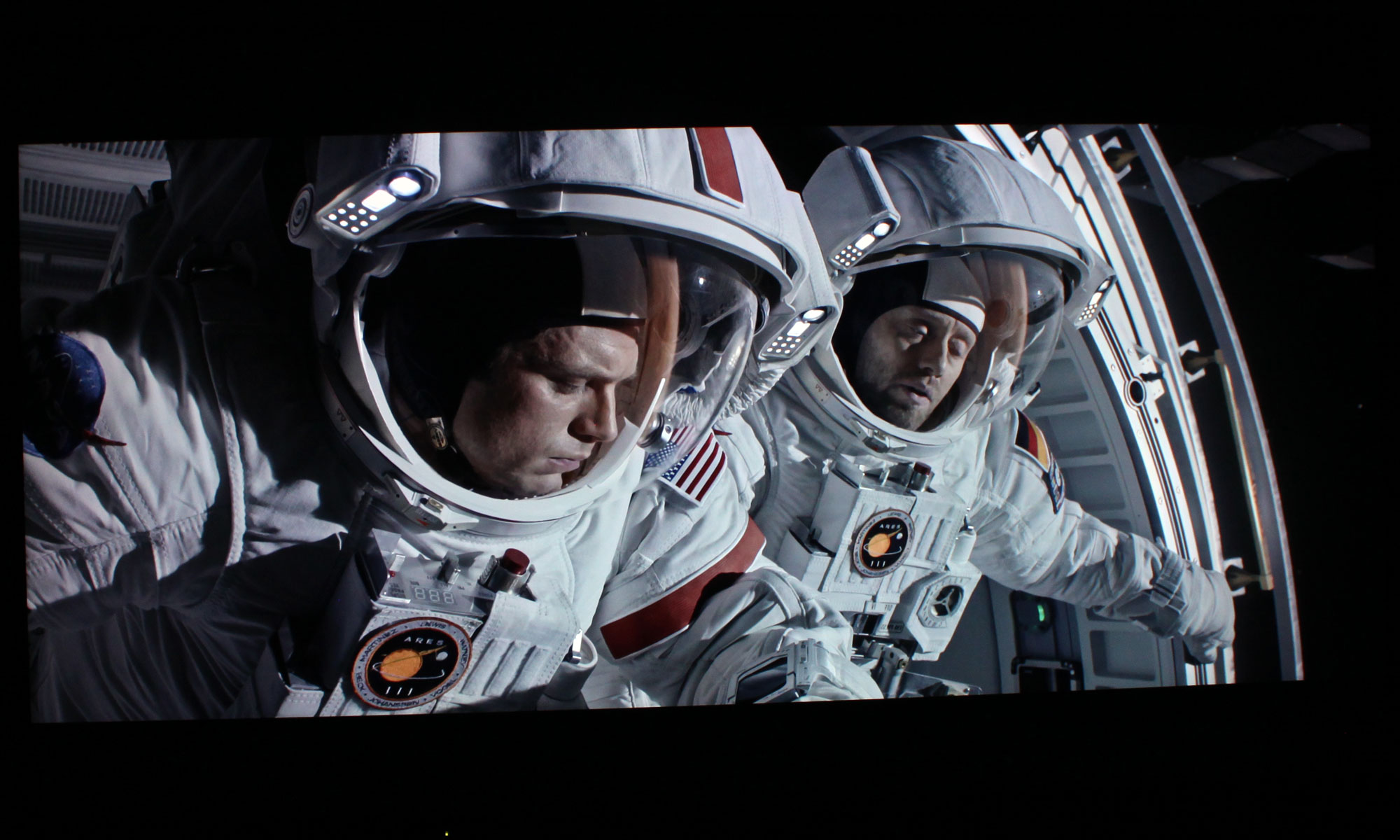 På billederne nedenfor har vi prøvet at fange nogle af scenerne, men da vores kamera – og din skærm – ikke kan vise HDR og det større farverum, så er det naturligvis ikke helt retfærdigt. Bemærk dog detaljerne i ansigtet og dynamikken. På billedet med de to mædn i rumdragt ses et lille lyspanel til venstre for hjelmen til venstre. Dette lyspanel lyser virkelig op, hvilket kan fornemmes i billedet. Reflektioner fra solen i hjelmen fremstår også med en intensitet, som langt overgår alt hvad man ser på normale Blu-ray-skiver.