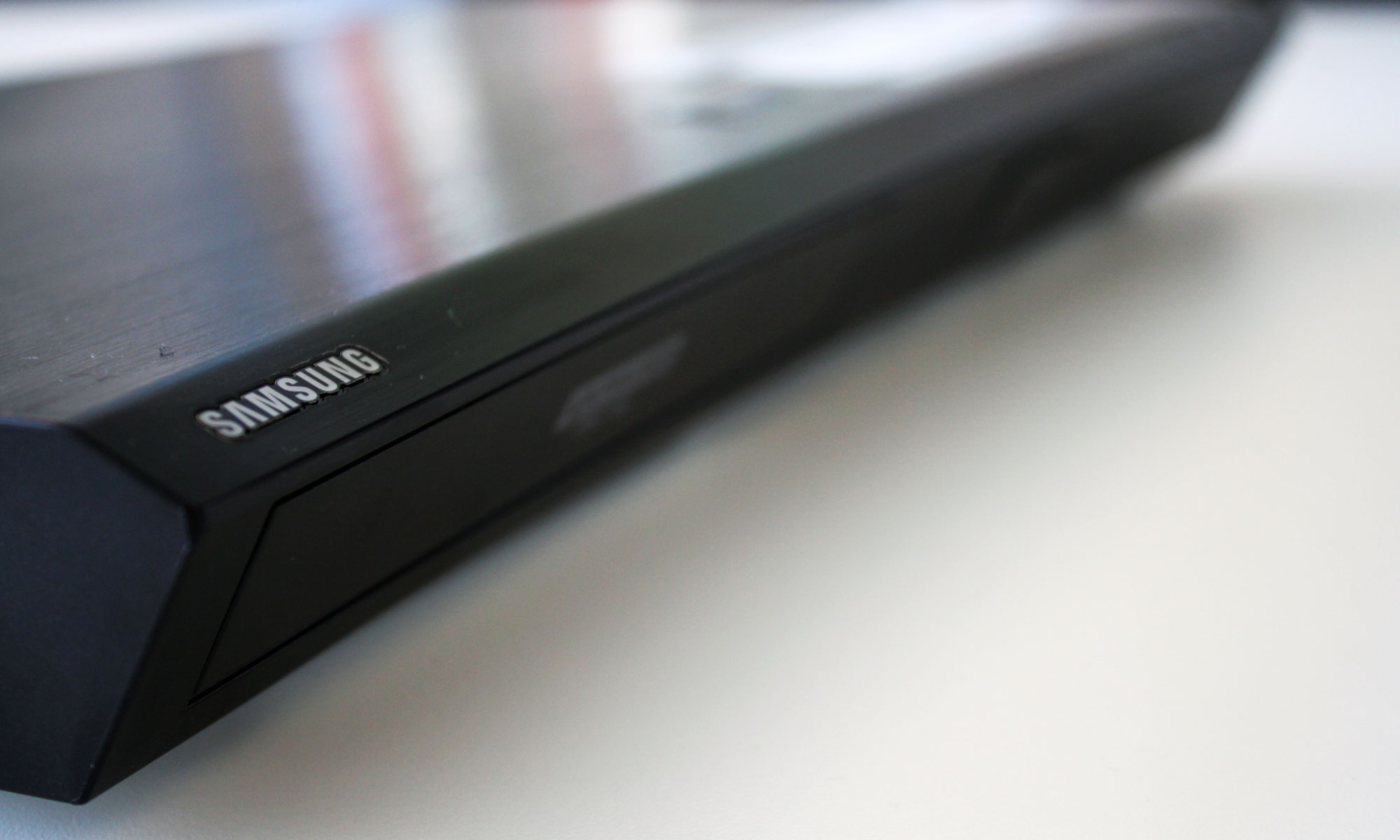 Blu-ray-afspillere ser ud som Blu-ray-afspillere gør. Relativt store rektangulære kasser, som ikke er videre appellerende for øjet. De er designet til at stå på en hylde og kun kræve opmærksomhed, når skiveskuffen kører frem. Når det er sagt, så har Samsung dog krydret deres version en smule ved at gøre fronten og bagsiden let buet. De siger, at det komplementerer deres buede tv-skærme. Tja, det gør det vel.