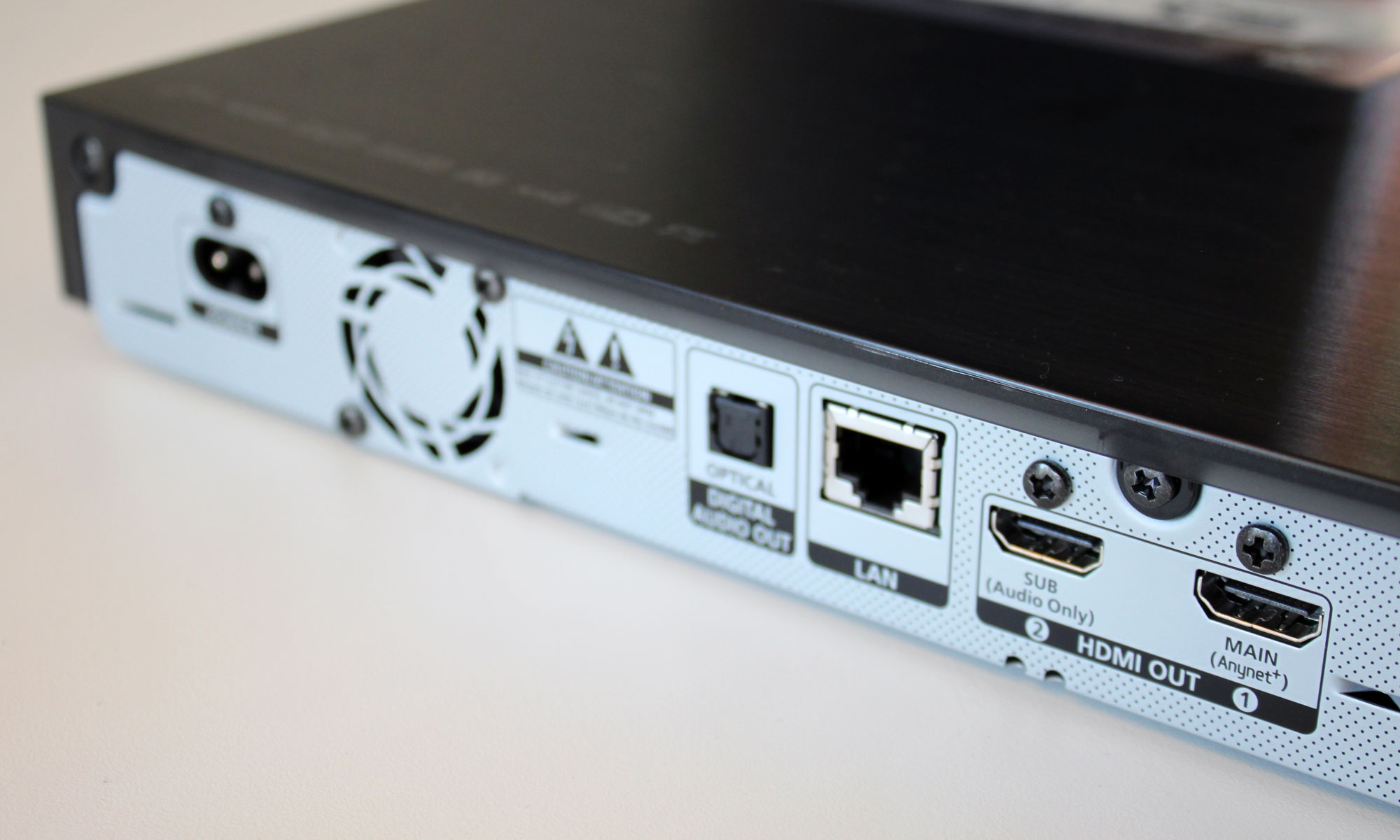 Der er to HDMI-porte på bagsiden; en til billede og en til lyd. Herudover finder man optisk lydudgang, men hvis du har planer om at nyde HD-lyd, så skal du bruge HDMI-porten. Du behøver i øvrigt ikke nye HDMI-kabler til UHD Blu-ray-afspillere, dine gamle er helt fine – uanset hvad forhandleren fortæller dig! Der er heller intet HDMI-kabel i kassen. Strømforsyningen er integreret så alt hvad du har brug for at et strømkabel. Der er inkluderet et vinklet strømkabel i kassen, men strømudtaget på boksen er lidt klodset placeret. Enten dækker strømkablet noget af blæserudgangen eller også stikker det ud over afspillerens ydrekant.