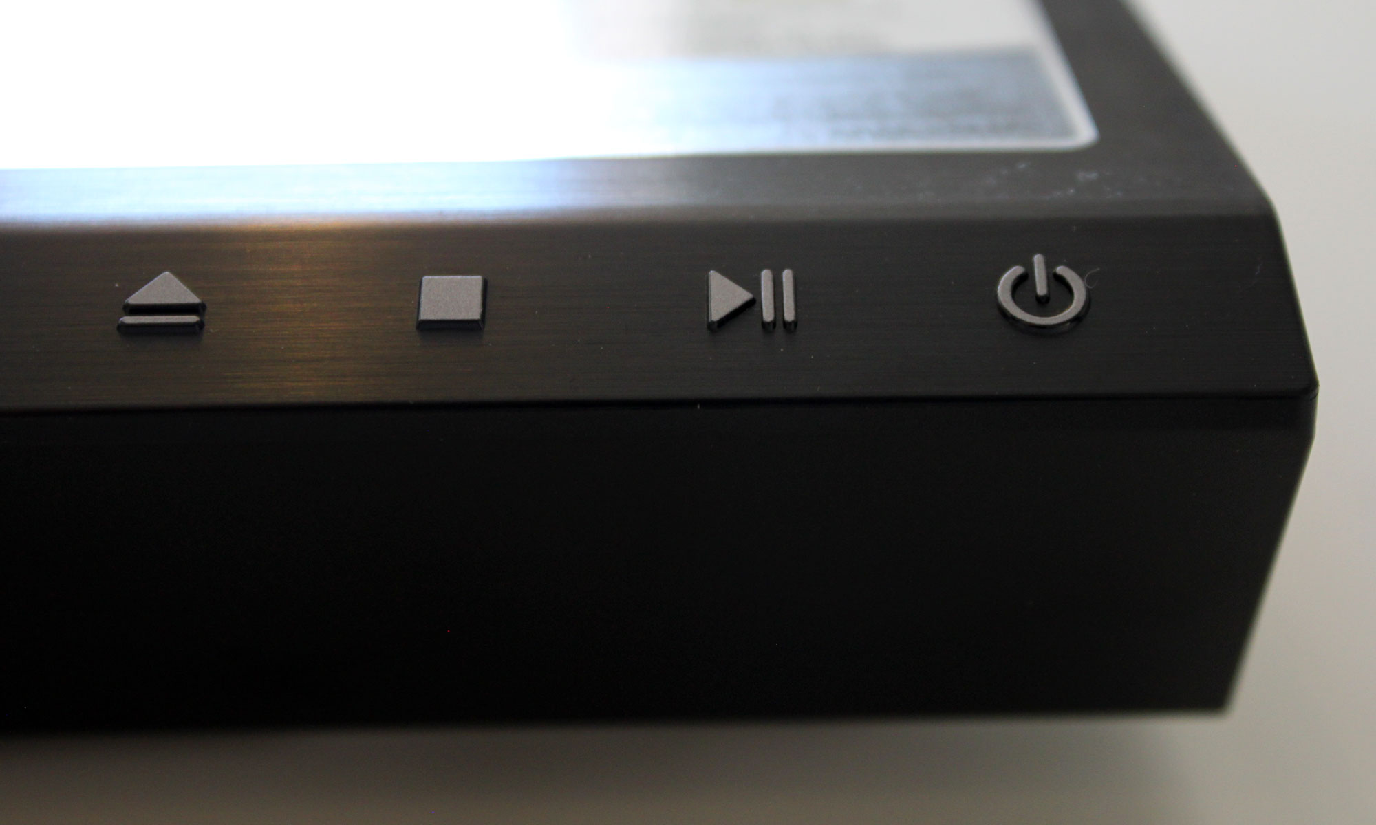 Der er nogle få knapper på afspilleren øvre mod højre. Skuffen til skiver er placeret ovre mod venstre og er gemt bag en lille låge, der vipper ned, når skuffen kører ud. Den vipper også automatisk op, når skuffen kører ind igen.