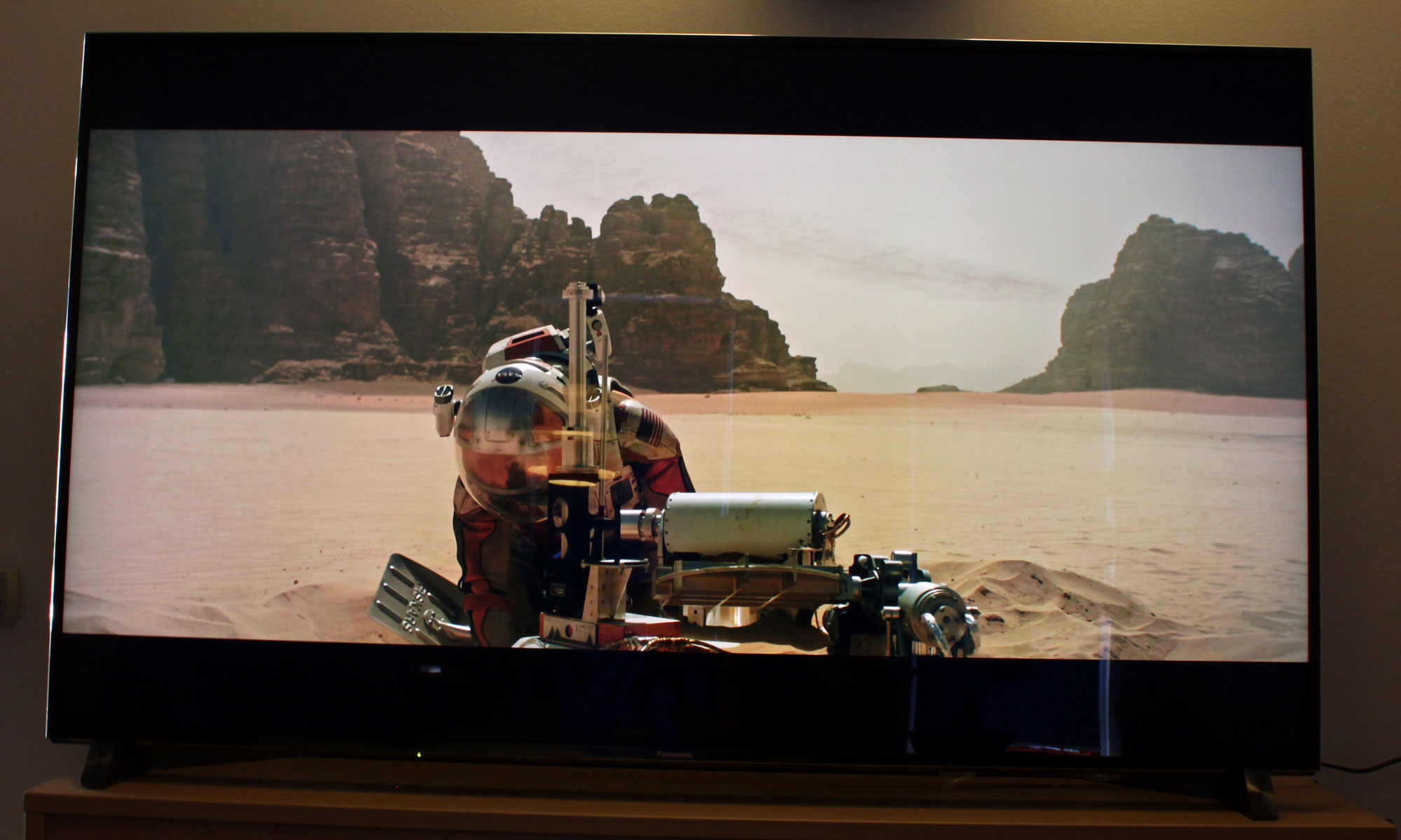Herunder ses et billede af The Martian i dagstimerne. Ignorer, at farverne ser lidt matte ud – det skyldes blot kameraet. Der er vinduer modsat tv’et, men gardinerne er rullet ned. Det var stadig muligt at nyde filmen med gardinerne rullet op, men naturligvis generende pga. reflektioner.
