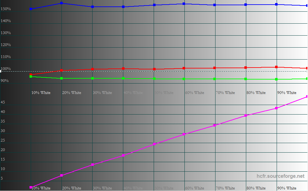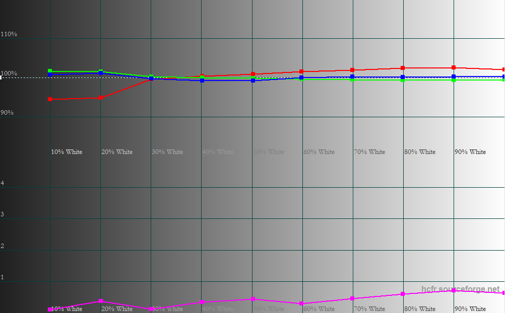 ISF-profilen er i sig selv dog ikke nok til at give et godt resultat og den er synligt alt for rød i sin tone. Man kan vælge andre farvetemperaturer, men de øvrige er for blå, så hvis man er ude efter et korrekt billede, så skal der tweakes lidt ekstra. Hvis man som bruger ikke ønsker at justere på RGB-værdierne, så ville vi nok være tilbøjelige til at foretrække et lidt mere blåt billede end et lidt mere rødt, så i dét tilfælde bør du skifte til farvetemperaturen "Varm 3" og ikke "Varm 2" som vi bruger som udgangspunkt.