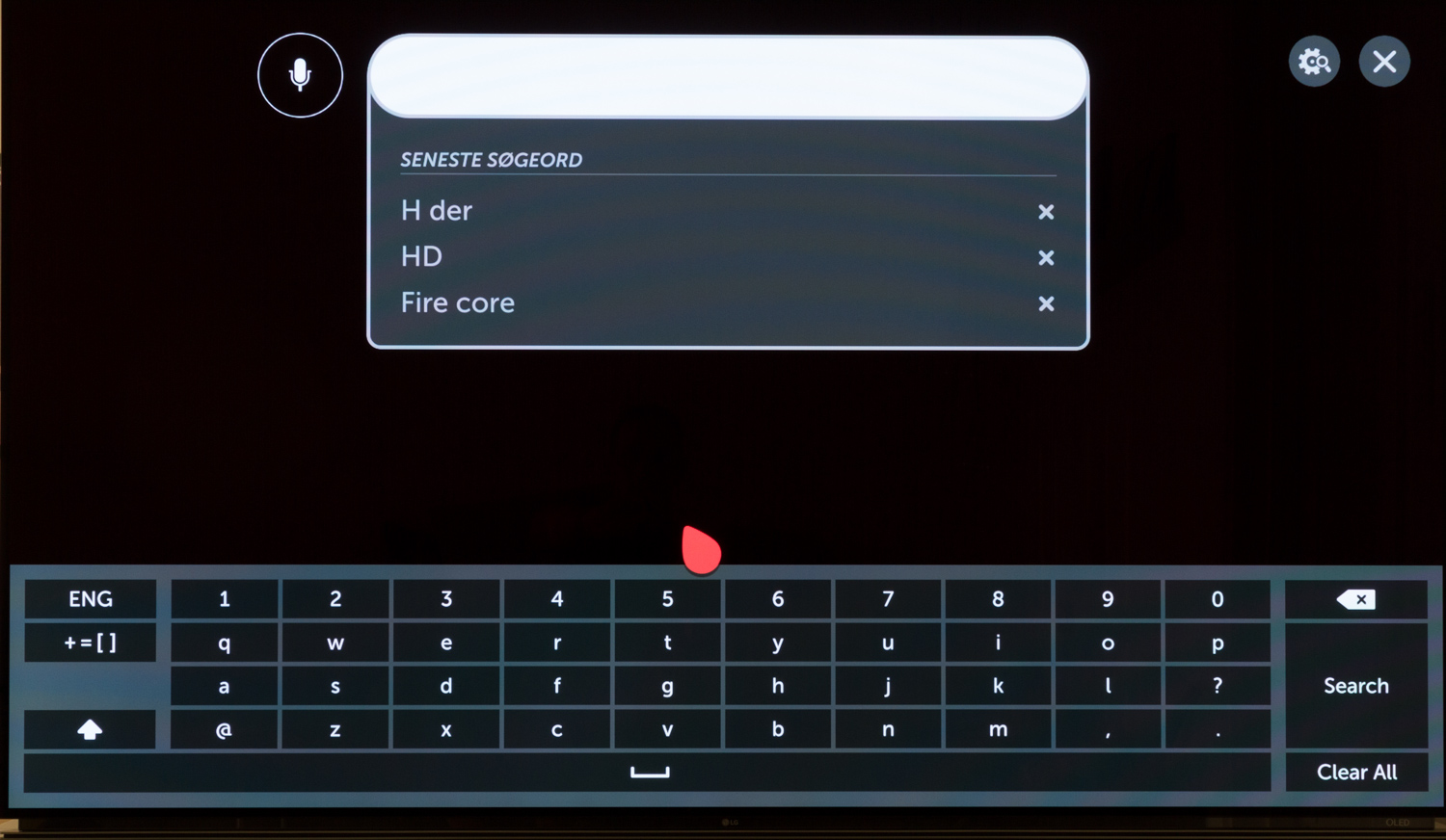 Midt på fjernbetjeningen finder man genvejen til søgefunktionen, som også fungerer som udløser for mikrofonen hvis den holdes inde. LG sværger til at inkludere et lille scroll-hjul i center-knappen, som kan bruges i de fleste menuer eller til at skifte kanal med, og hvor idéen måske er god nok som udgangspunkt, så er hjulet lidt for stift i scroll-funktionen til for alvor at være brugbar, da man ofte kommer til at klikke den mere end ét hak af gangen fordi der skal drejes lidt hårdt på den før den ruller. Omvendt så må det heller ikke være for let at dreje den, da knappen også fungerer som "OK" knap, så det er svært at komme med konstruktive løsningsforslag hvis hjulet skal have lov at blive.