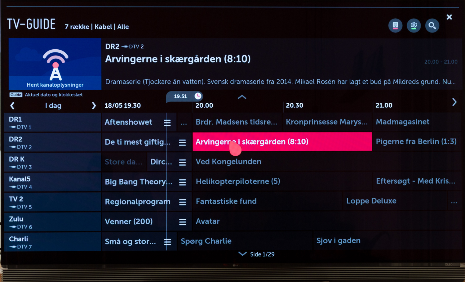 TV-delen ligner sig selv på webOS 3 og TV-guiden ligeså. Navigation mellem kanaler kan, som nævnt, klares vha. scroll-hjulet, men der er også en dedikeret Kanal +/- knap, som du kan zappe med. Kanalskift sker i anstændigt tempo, men ikke noget der hæver øjenbryn. Adgangen til TV foregår ligesom adgang til apps, dvs. via en fane i bunden, men derudover kan der tilføjes favorit-kanaler, som altid er direkte tilgængelige fra menuen.