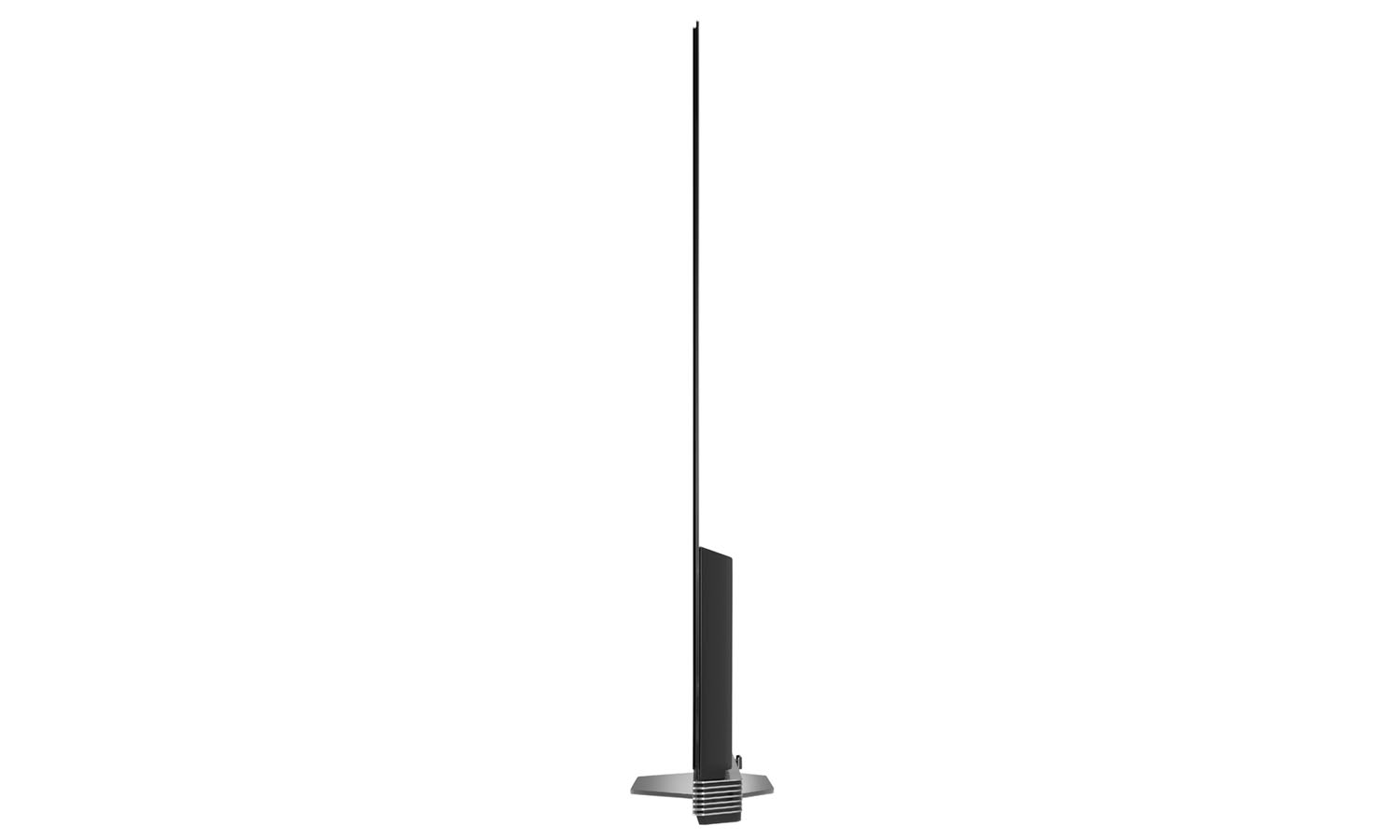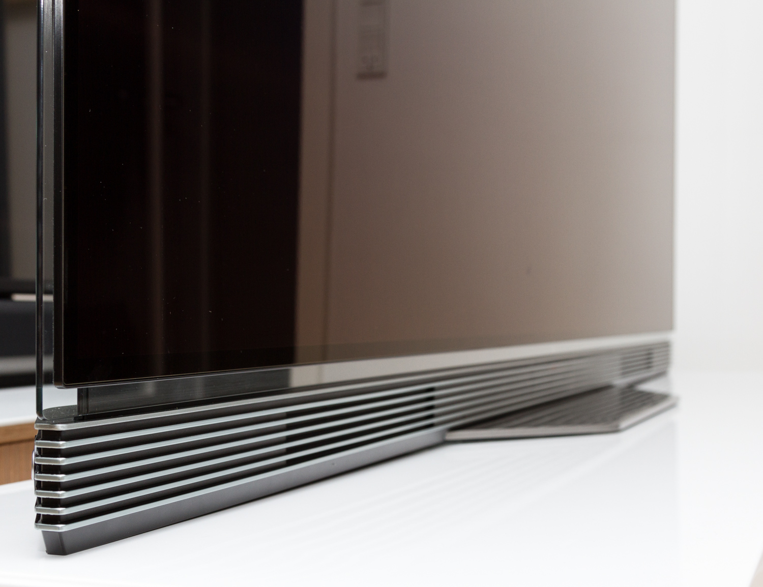 Hele herligheden er tyndere end en iPhone og det ser helt vanvittigt ud når den står der på sin fod. Endnu mere vanvittigt er det dog, at den måde foden skal monteres på, er ved at lægge skærmen på maven og skrue den i nedefra! Det føles MEGET forkert at tage en så tynd glasplade med 65" i diagonalen og vende den ud i fri luft. Det må simpelthen være en nødløsning at foden skal skrues fast på den måde.