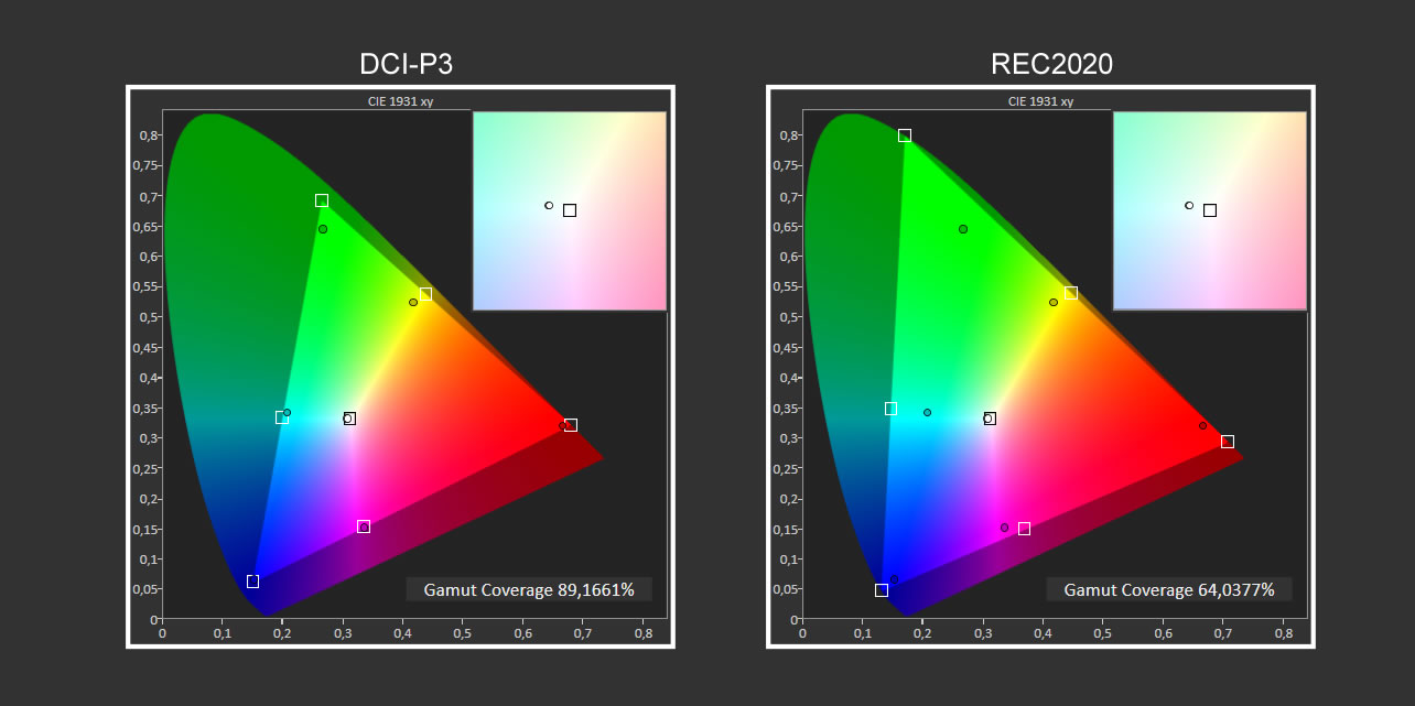 Ser vi på HDR-gengivelsen, så er Biograf-profilen stadig fornuftig med acceptable afvigelser på hvidbalancen op til knækket på EOTF-kurven, hvor baggrundsbelysningen giver op, men dækningen af DCI-P3 farverummet når kun op på 89%. Det sammenligneligt med andre LCD-skærme fra Sony og er dermed ikke overraskende, men det er en smule under hvad andre producenter kan præstere.
