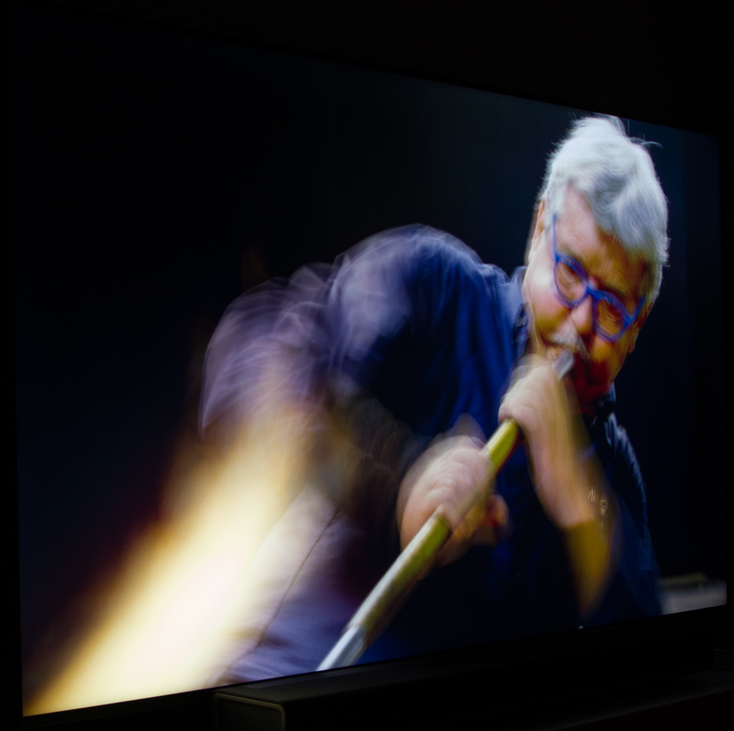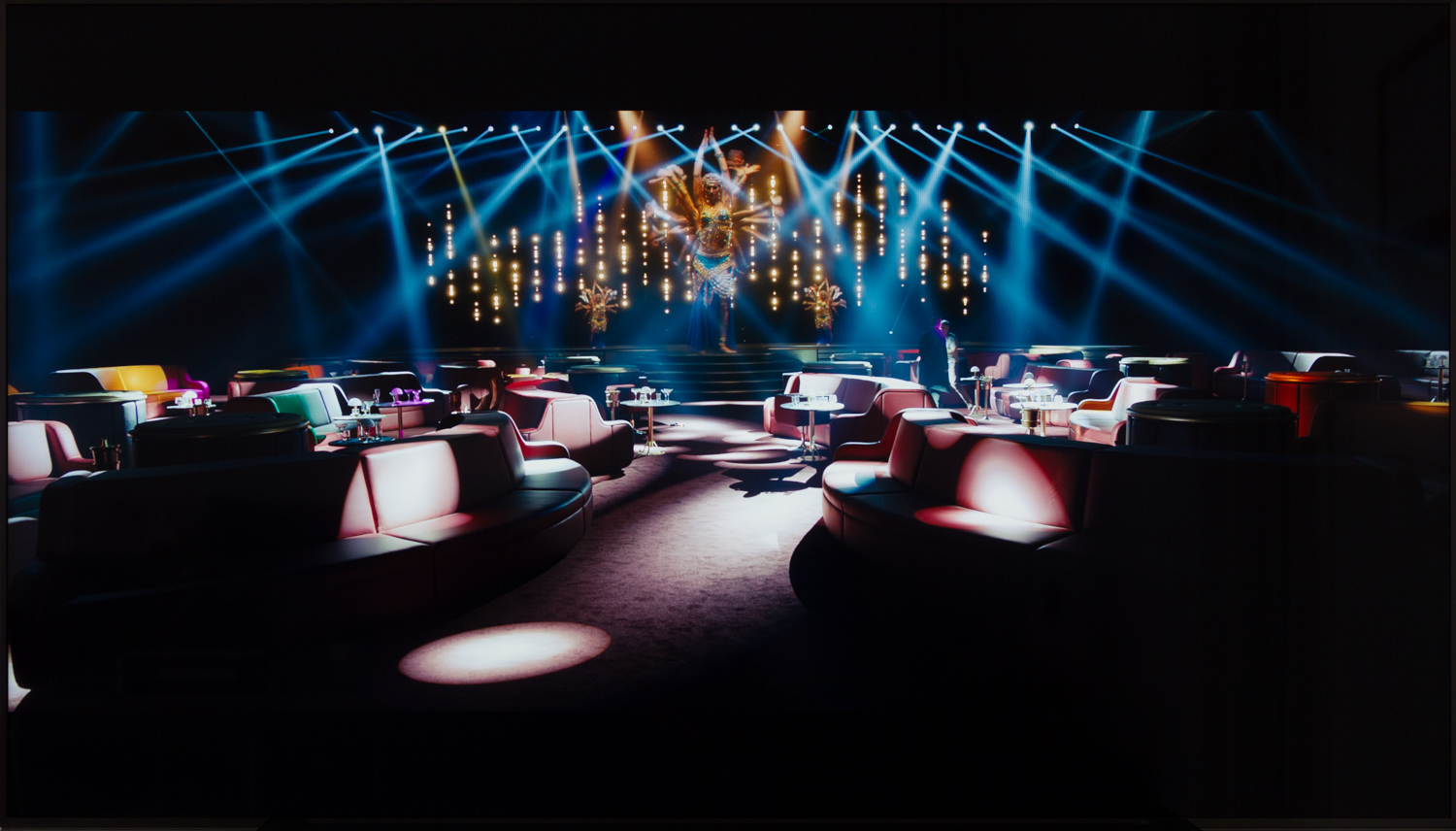 På det første billede herunder kan effekten ses, men når først musikken spiller, så er det primært i disse stress-situationer med meget lyse elementer på en ellers mørk baggrund, at problemet er fremtrædende. Problemet forværres drastisk hvis man bevæger sig væk fra center af TV, men det kommer vi ind på om lidt.