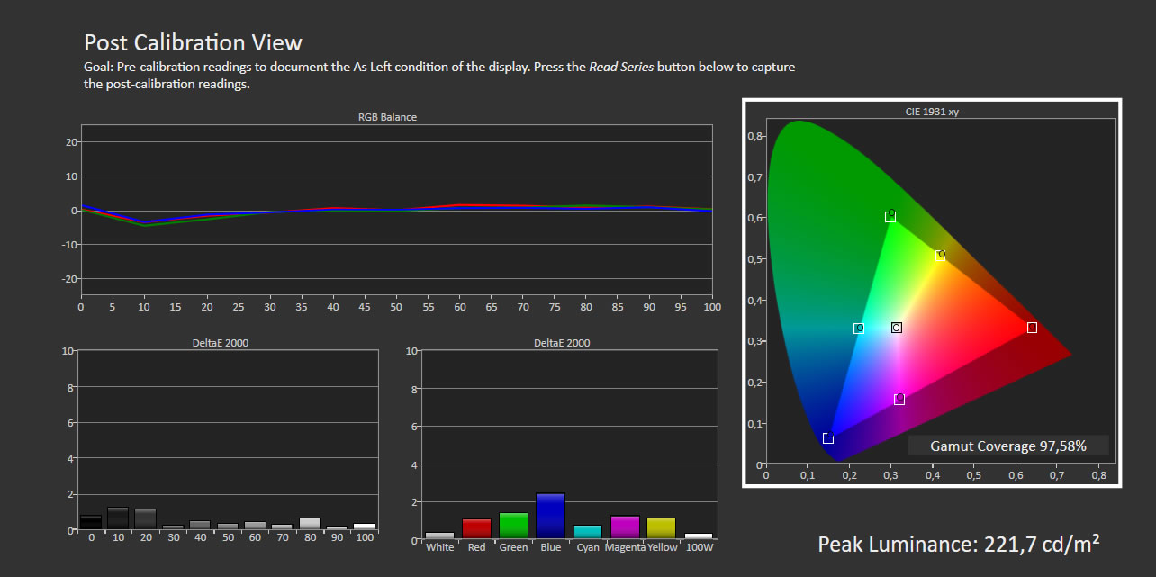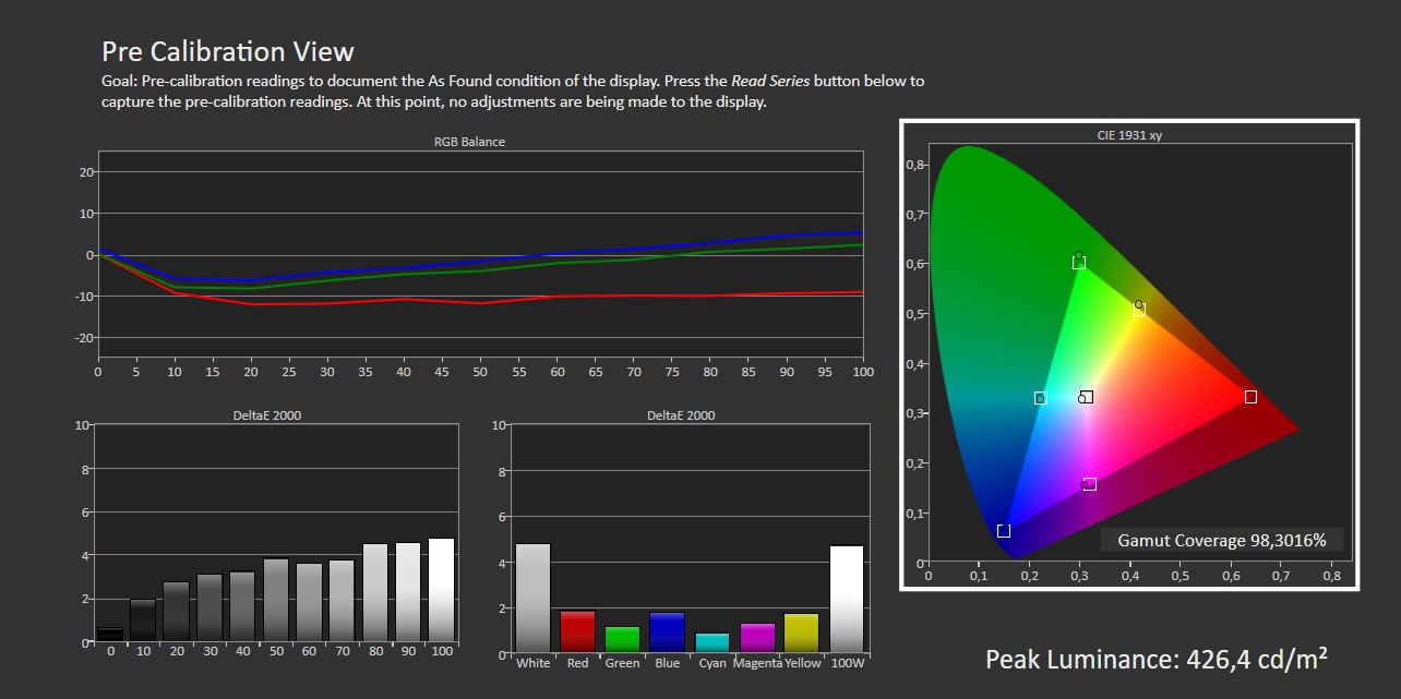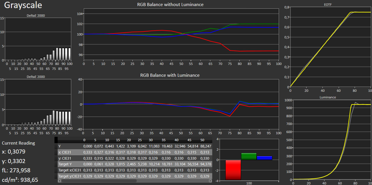 Vi kalibrerer normalt skærmene med alle dynamiske kredsløb deaktiveret, hvilket også omfatter den dynamiske baggrundsbelysning. Vi kommer dog til at anbefale, at denne slås til for at få maksimal udnyttelse af de features, som XF90 tilbyder, og det påvirker hvidbalancen en smule, så herunder vises den “normale” kalibrering uden dynamisk belysning. Forskellen vil ligge i justeringen af hvidbalancen.