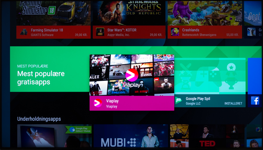 Hovedmenuen “Home” hidkalder i version 7.0 den velkendte skærm med anbefalinger i toppen, Sonys udvalgte Apps i næste række og egne apps i 3. række. Der er dedikeret en række til spil, men med den processor, som Sony benytter til at drive Android TV, så vil de færreste nok begive sig ud i at bruge XF90 som “spilkonsol”. Sidste række viser TV’ets indgange, hvor “Streamingkanaler” stadig mangler at finde virkelig anvendelse herhjemme. Potentielt kunne den dog blive interessant, hvis flere tjenester understøttede den. App-udviklerne kan bygge deres apps, så de giver mulighed for EPG, forældrekontrol osv. og lade det figurere som en flow-kanal.