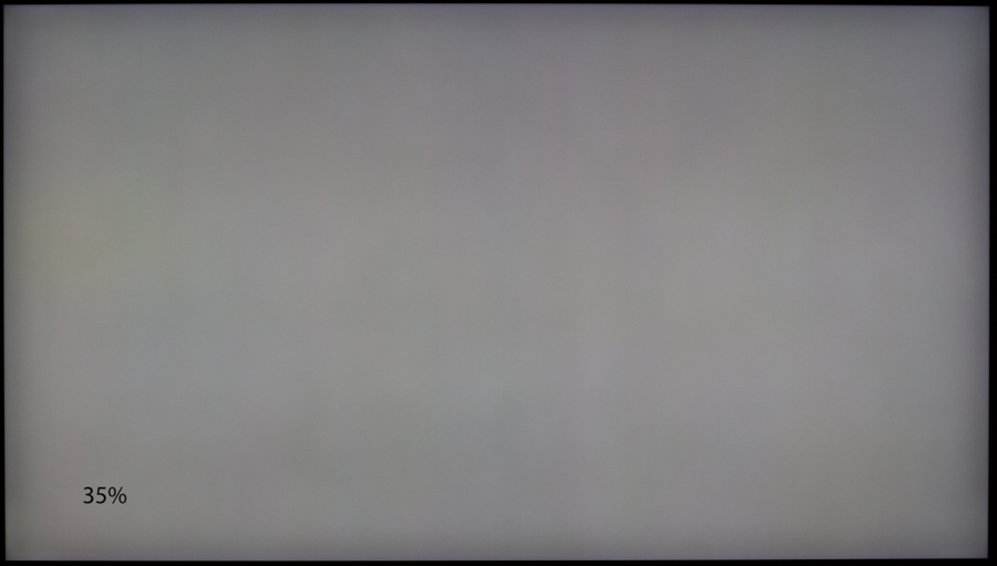 Dæmper vi lyset og stresstester skærmens homogenitet, så ser det kritiske øje en smule inhomogenitet, hvor midten af skærmen fremstår mørkere end siderne, hvilket dog til dels er en effekt af skærmens coating. Da skærmen "kun" er forsynet med 480 zoner til at styre lyset i, så er det også klart, at en stresstest af lokal lysstyring vil afsløre en vis portion blooming, som det også ses herunder. Blooming af helt lyse elementer på en sort baggrund er én ting, som egentlig ikke er så problematisk i sig selv, men hvis man applikerer samme blooming i et billede, hvor omgivelserne ikke er sorte, men en del af noget andet, så vil man i stedet få en udvaskelse af farverne i et lokalt område. Resultatet ses lettest på HDR-materiale, hvor man til tider kan spotte områder omkring helt lyse objekter, som fremstår matte i farverne. I underteksterne har Samsung tilsyneladende arbejdet lidt med at undgå, at disse skaber blooming i de sorte bjælker, men med det resultat, at de ofte fremstår noget afdæmpede.